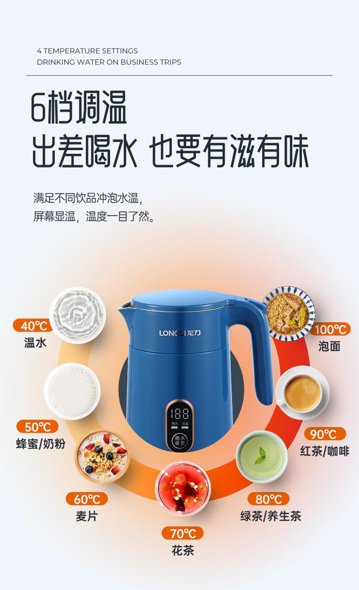 隨時(shí)隨地照顧好自己任何時(shí)候喝上一口溫水,都是一件幸福的事。出于不同飲品沖泡水溫的考慮,水壺適配了6檔調(diào)溫的功能,讓你出差喝水也能有滋有味。屏幕顯示溫度,水溫一目了然。無論是早上來一杯提神咖啡,下午來一杯養(yǎng)生花茶,還是晚上為寶寶快速沖奶,都能滿足你的需求。